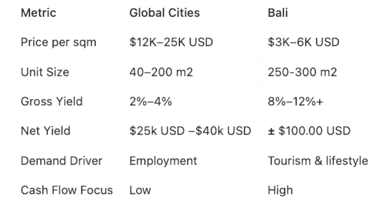 Bali positions property as a yield-driven, lifestyle-backed asset rather than a prestige holding.